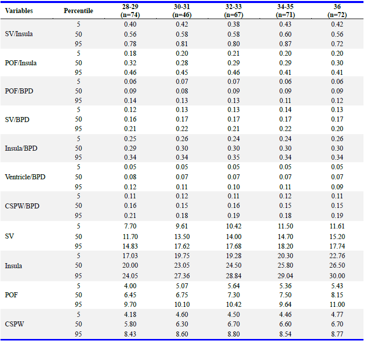 In this study, a standardized method was used for assessing the main fetal brain sonographic indices including the insula, Sylvian fissure, parieto-occipital fissure, diameter of the lateral ventricle, and CSP width, consistent with methods used in other similar studies (1, 21, 22). The main benefit of these methods is that the measurements can be taken from standard ultrasound planes used for biometric assessments. Since the measurement landmarks were easily identifiable, fetal maturation could be effectively evaluated during routine scans.
