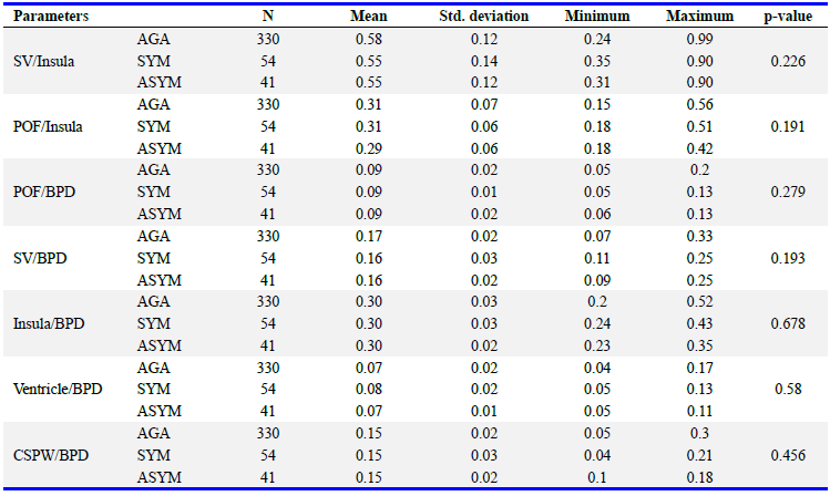 The study presents a detailed analysis of various brain sonographic indices and ratios in AGA and FGR fetuses, focusing on gestational weeks 28 to 36. According to the findings, there were no significant differences in the measured ratios (SF/ Insula, POF/Insula, POF/BPD, SF/BPD, Insula/ BPD, ventricle diameter/BPD, and CSP width/ BPD) between AGA and both symmetrical and asymmetrical FGR fetuses in all categories of gestational weeks (p<0.05 ) (table 2).