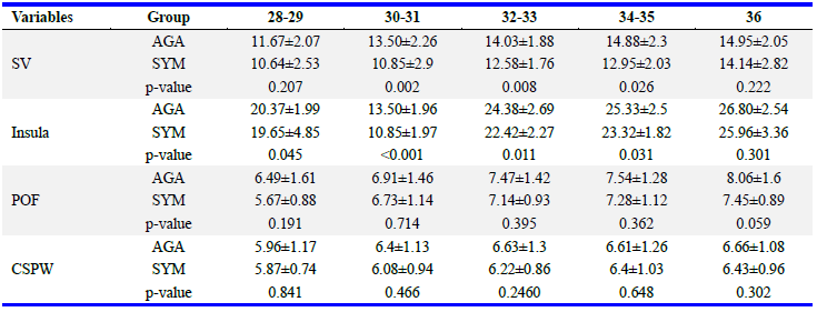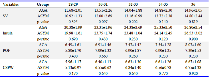 However, when examining unadjusted measurements, significant differences were observed between AGA and symmetrical FGR fetuses with a head size below the 10% percentile. At certain gestational ages, Sylvian and insular depths were significantly smaller in these two study groups (p<0.05 ) (table 3). sylvian fissure depth between 30 and 35 weeks of gestation and insular depth between 28 and 35 weeks were significantly smaller in fgr fetuses compared to aga fetuses. conversely, no significant differences were found in the measured indices between aga and asymmetrical fgr fetuses with normal head sizes (p>0.05) (Table 4).
