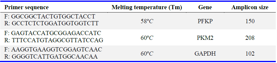 Real-time PCR: Gene expression of PFKP and PKM2 was analyzed by real-time PCR using gene-specific primers (Sinaclon, Iran) and GAPDH as a housekeeping gene (Table 1). Relative expression was calculated using the 2−ΔΔCt method:
