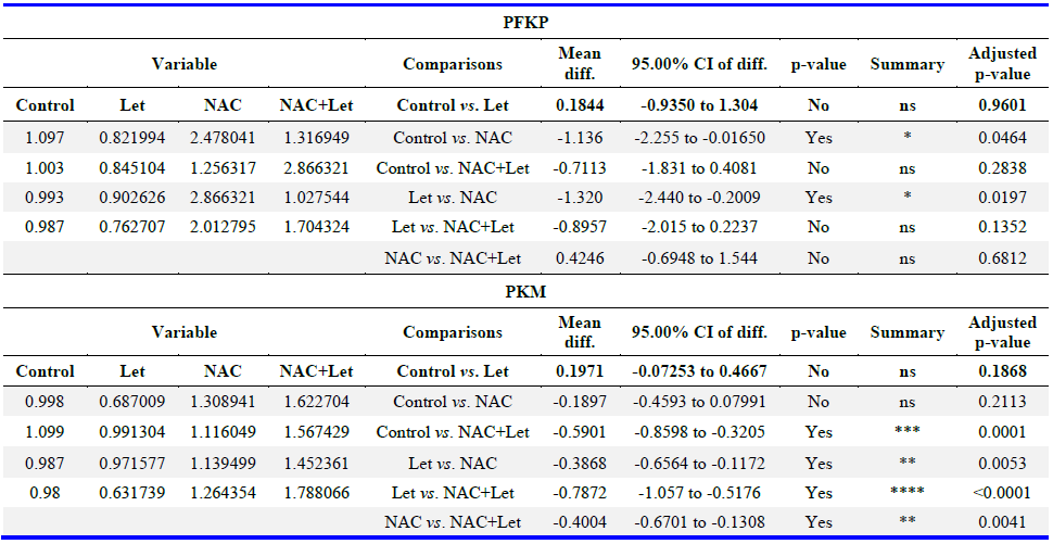 In this study, the expression level of the PFKP gene was increased in the NAC group compared to the letrozole and control groups, and the PKM2 gene was also increased in the letrozole plus NAC group compared to the letrozole, control, and NAC groups (Table 2).