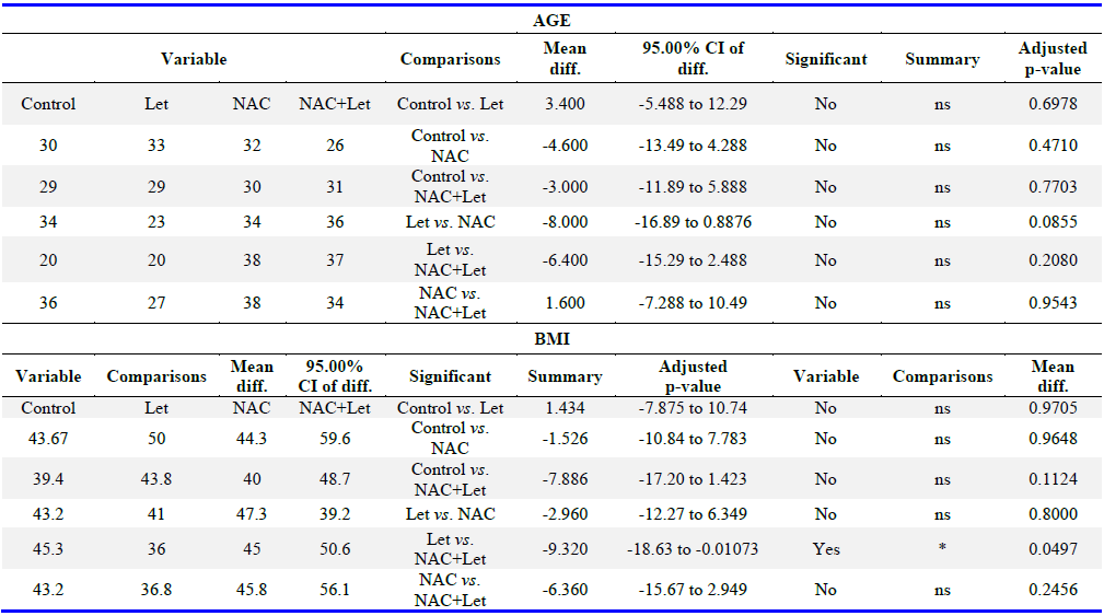 Comparison of baseline age and BMI among study groups: Comparison of age variable among the study groups showed no significant difference between the group receiving letrozole plus NAC and the letrozole group (p>0.05) (Table 3). However, BMI comparison revealed a significant difference between these two groups, with the letrozole plus NAC group showing a higher or lower BMI (p<0.05 ) (table 3).<>