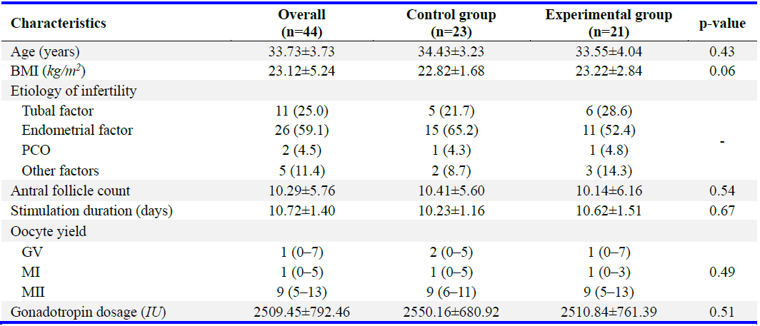 factors was 6 (28.6%), 11 (52.4%), 1 (4.8%), and 3 (14.3%), respectively. No significant differences were found in terms of the etiology of infertility between groups. The antral follicle count, stimulation duration, and total gonadotropin dosage were similar between the control and the experimental group (10.41±5.60 vs. 10.14±6.16, p=0.54; 10.23±1.16 vs. 10.62±1.51, p=0.67; and 2550.16±680.92 vs. 2510.84±761.39, p=0.51).