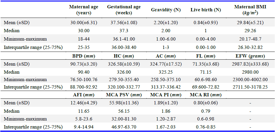 During 2021-2023, a total number of 150 pregnant women were included in the study. Demographic features of the participants and their fetal biometry indices are shown in table 1.
