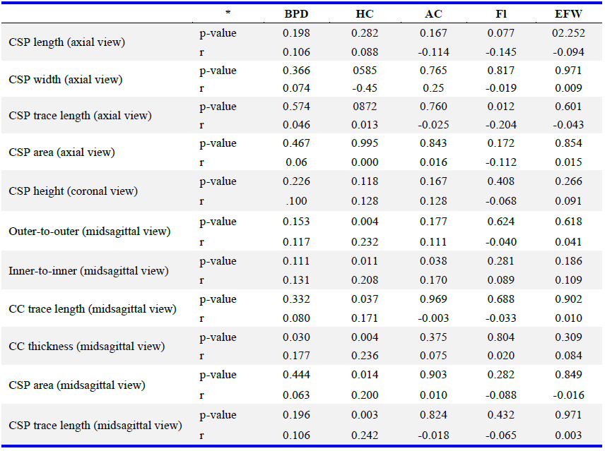 To assess the correlation between CSP and CC indices with fetal biometric parameters, Pearson’s correlation was applied. Briefly, it was found that CC and CSP indices in midsagittal view were correlated with fetal head circumference (p<0.05 ) as shown in table 3.