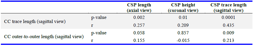 Spearman’s test was also applied to assess correlation between CC trace length and outer- to-outer length in the midsagittal view, as well as CSP trace length in the same view, and CSP length and height in axial and coronal views, respectively. CC trace length in the midsagittal view showed a direct correlation with all CSP indices (Table 4).