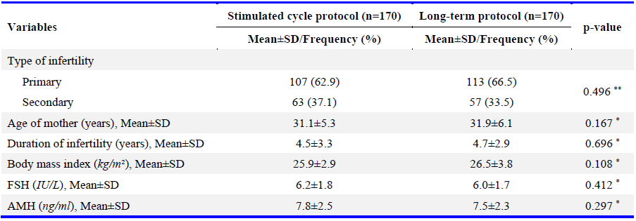 Baseline demographic and clinical characteristics, including age, BMI, duration of infertility, and type of infertility, were statistically comparable between the two groups. For example, the mean age was 31.9±6.1 years in the long protocol group and 31.1±5.3 years in the ovulation stimulation group (p=0.167). Full details are presented in table 1.