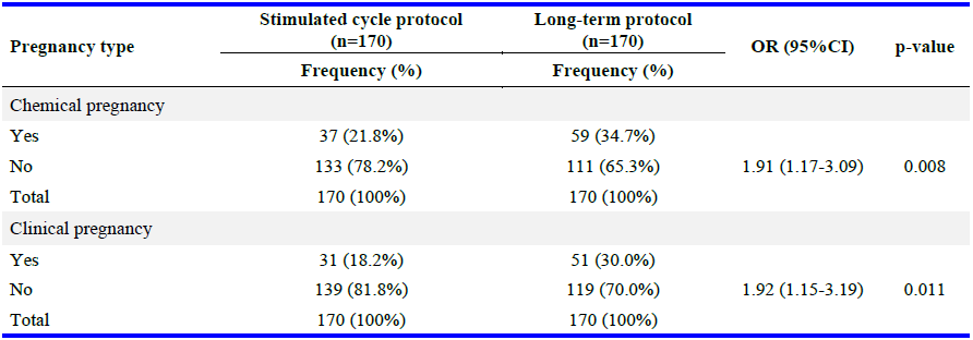 Pregnancy outcomes: The chemical pregnancy rate was 38.2% (65/170) in the long protocol group and 24.7% (42/170) in the ovulation stimulation group, with an odds ratio (OR) of 1.91 (95%CI: 1.20–3.05; p=0.006). Similarly, the clinical pregnancy rate was 35.9% (61/170) in the long protocol group and 22.9% (39/170) in the ovulation stimulation group (OR=1.92, 95%CI: 1.17–3.15; p=0.011). These results are summarized in table 2.