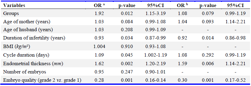 Statistical analysis: Sample size was calculated using G*Power software based on a previous study by Pilehvari et al. (8), which reported clinical pregnancy rates of 20% and 33.3% in the two groups. A total of 340 participants were included to ensure adequate power. Data were analyzed using SPSS version 20 (IBM Corp., USA). Continuous variables were expressed as mean±SD and compared using independent t-tests. Categorical variables were compared using chi-square tests. Multivariate logistic regression was used to control for confounding variables such as age, BMI, endometrial thickness, and embryo quality. A p< 0.05 was considered statistically significant.7>7>